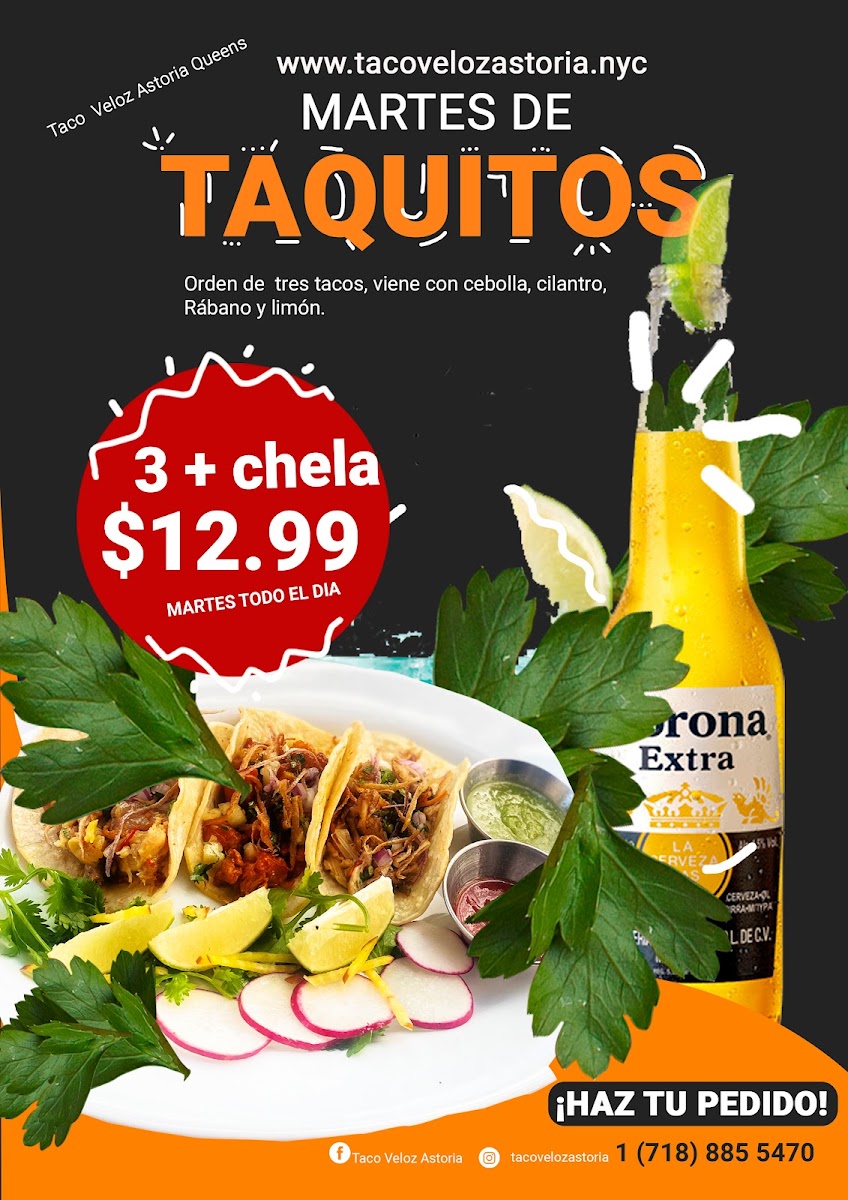 At Taco Veloz in Astoria, we’re all about bringing the flavors of Mexico right to your plate with a menu that celebrates the richness of traditional dishes. Taco Veloz Astoria Menu offers a mouthwatering array of tacos, from classics like al pastor and carnitas to unique combinations you won’t find anywhere else. Whether you're in the mood for something hearty or light, there's something to satisfy every craving. Alongside the tacos, you can enjoy freshly made salsas, savory burritos, and crispy tostadas that add even more excitement to your meal. It's not just about food - it's about experiencing authentic Mexican flavors in the heart of Astoria, all served with a warm, welcoming atmosphere that makes every visit feel like home. So, whether you're grabbing a quick bite or settling in for a relaxing meal, the menu here promises to be a treat for your taste buds.